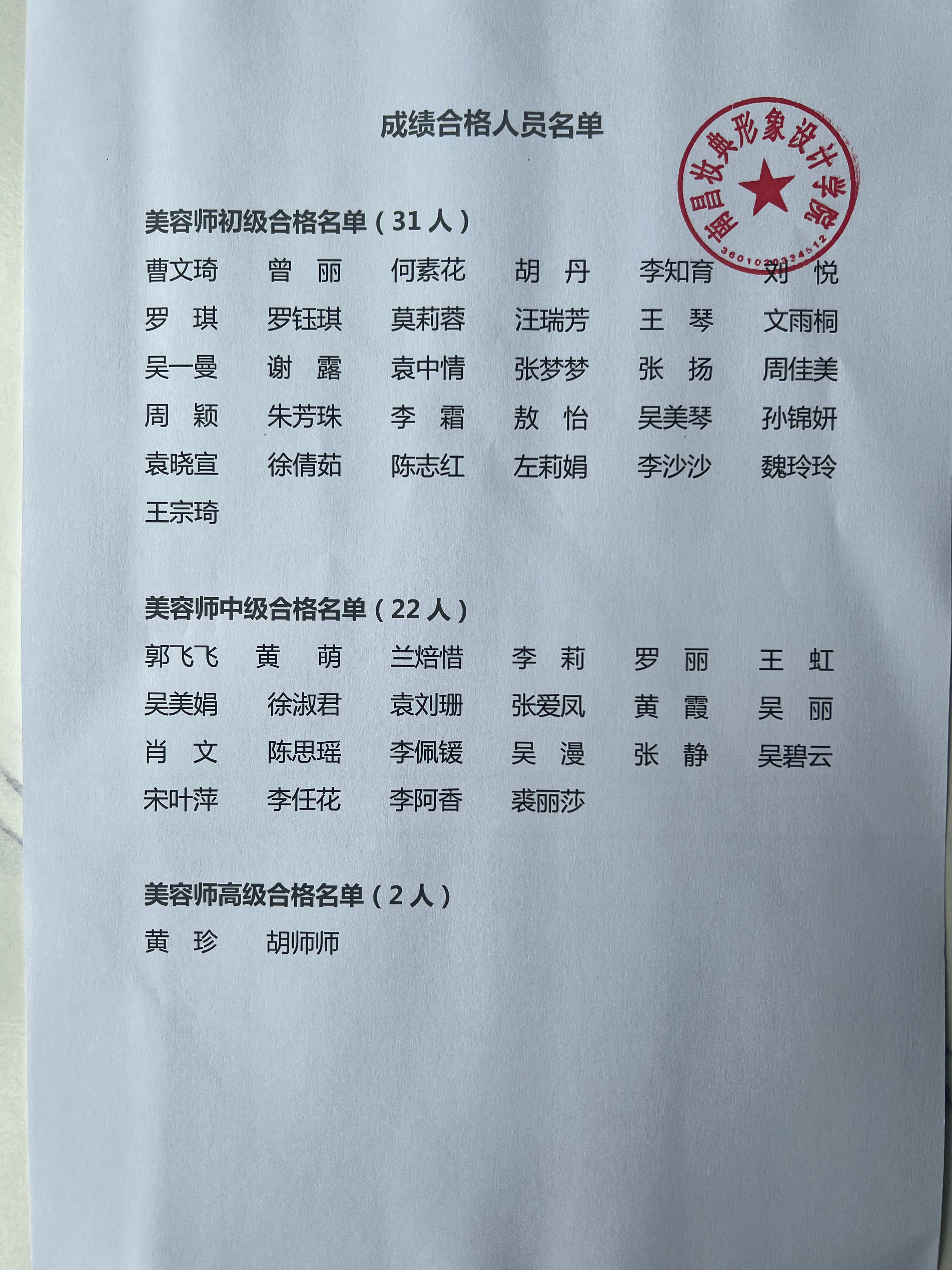 2024年6月25日,南昌妆典形象设计学院在红谷滩万达广场中心写字楼B2座16楼组织了一期职业技能等级认定工作(美容师五级/初级、美容师四级/中级、美容师三级/高级),现将曹文琦等55人考核成绩合格人员名单公示如下(具体名单附后),如有异议,请于2024年7月1日至7月8日前向南昌妆典形象设计学院考务办反映。地址:南昌市红谷滩新区会展路999号万达中心写字楼B2座16楼考务办,联系人:彭常青,联系电话:18170926786。