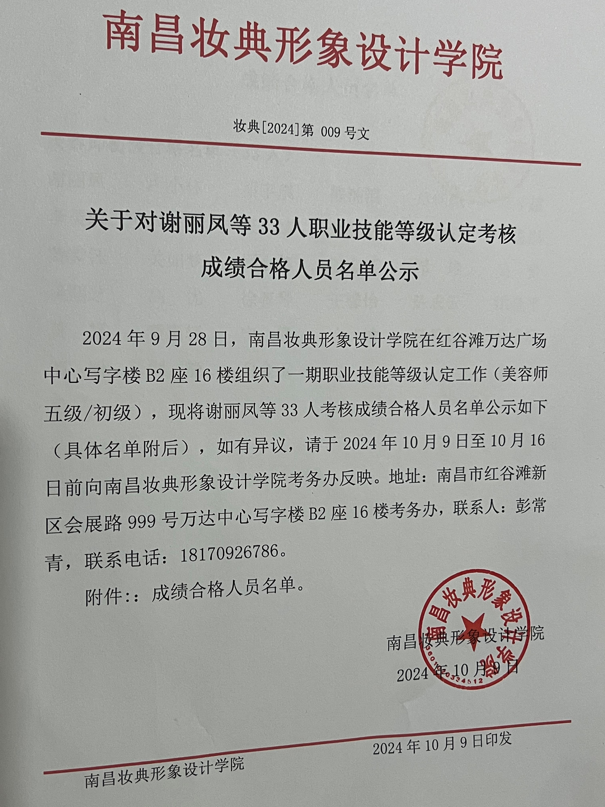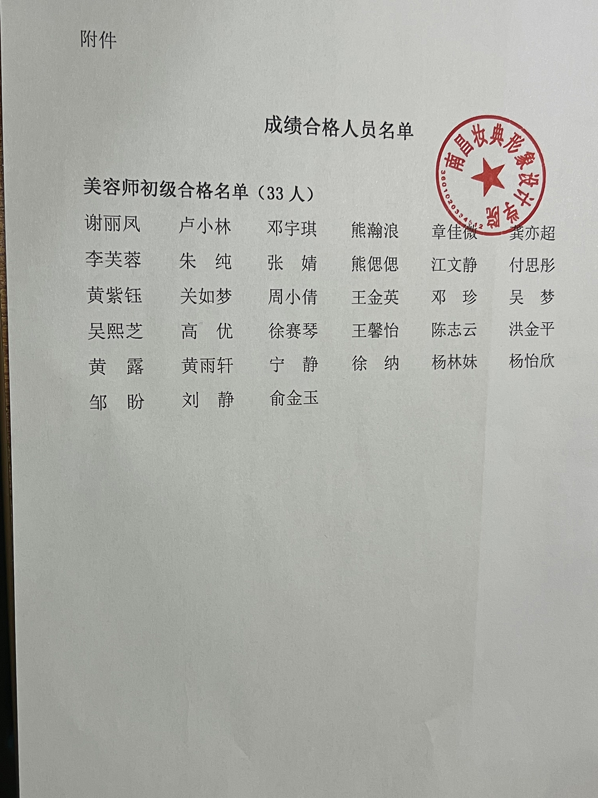 关于对谢丽凤等33 人职业技能等级认定考核成绩合格人员名单公示